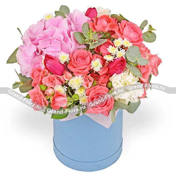 Стандартный: гортензия розовая - 1 шт., тюльпан розовый - 4 шт., гвоздика белая - 2 шт., хризантема сантини - 2 шт., роза кустовая розовая - 6 шт., эвклипт., оазис, коробка.